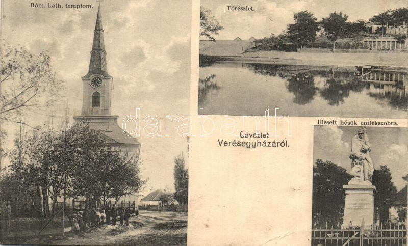 Veresegyháza, Hősök szobra, római katolikus templom, tórészlet (r) https://www.darabanth.com/hu/280-Gyorsarveres/280.0/Kepeslapok/Magyarorszag~200011/Veresegyhaza-Hosok-szobra-romai-katolikus-templom-toreszlet-r~II1413191