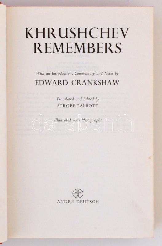 Edward Crankshaw: Khrushchev Remembers. Fordította Strobe Talbott.(Hruscsov hivatali működésének története.) London, 1971, Andre Deutsch. Kiadói egészvászon kötés, fekete-fehér fotókkal, angol nyelven, kisebb hiánnyal a védőlapon. /