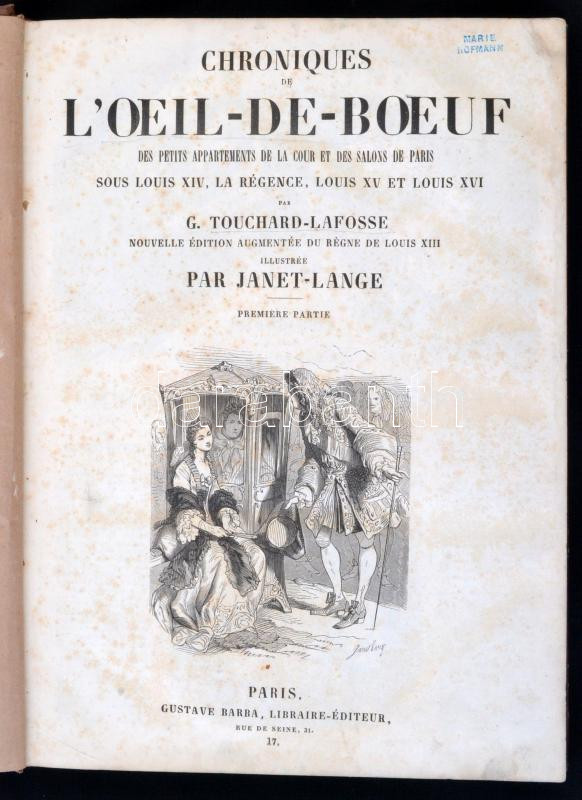 Chroniques de L'oeil-de-Boeuf des petits appartements de la cour et des salons de Paris sous Louis XIV, la régence, Louis XV et Louis XVI par G.Touchard-Lafosse mouvelle édition augmentée du régne de Louis XII illustrée par Janet-Lange. Paris, Gustave barba, Libraire-Éditeur. Újrakötött félvászon kötés, kissé kopottas állapotban.