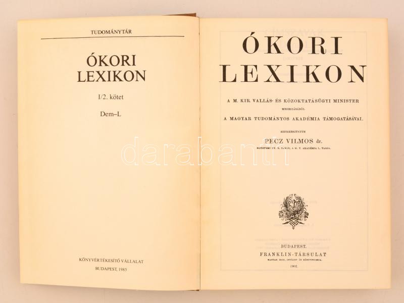 Ókori Lexikon I-IV. Szerk.: Dr. Pecz Vilmos. Tudománytár. Budapest, 1984, Könyvértékesítő Vállalat. Kiadói egészvászon kötés, szövegközti és egészoldalas illusztrációkkal. 1902 és 1904. évi kiadás hasonmás kiadása.