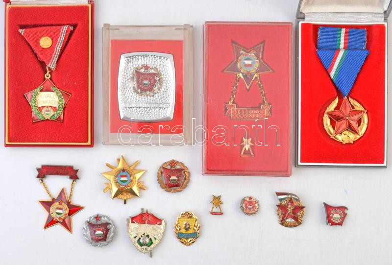 14db-os vegyes kitüntetés és jelvény a szocialista korszakból, néhány tokban, közte 1951. "Közbiztonsági Érem" arany fokozata a rendőrség tagjai részére, aranyozott kitüntetés mellszalagon, szalagsávval, tokban, ~1980. "Kiváló Munkáért" zománcozott kitüntetés mellszalagon eredeti tokban, miniatűrrel a szalagsávon T:2-3
