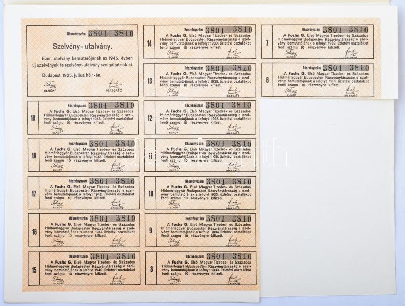 Budapest 1925. "Fuchs G. Első Magyar Tizedes és Százados Hídmérleggyár" tíz részvénye összesen 100P-ről (3x) mindhárom szárazpecséttel és szelvényekkel, sorszámkövetők T:I- kis fo.