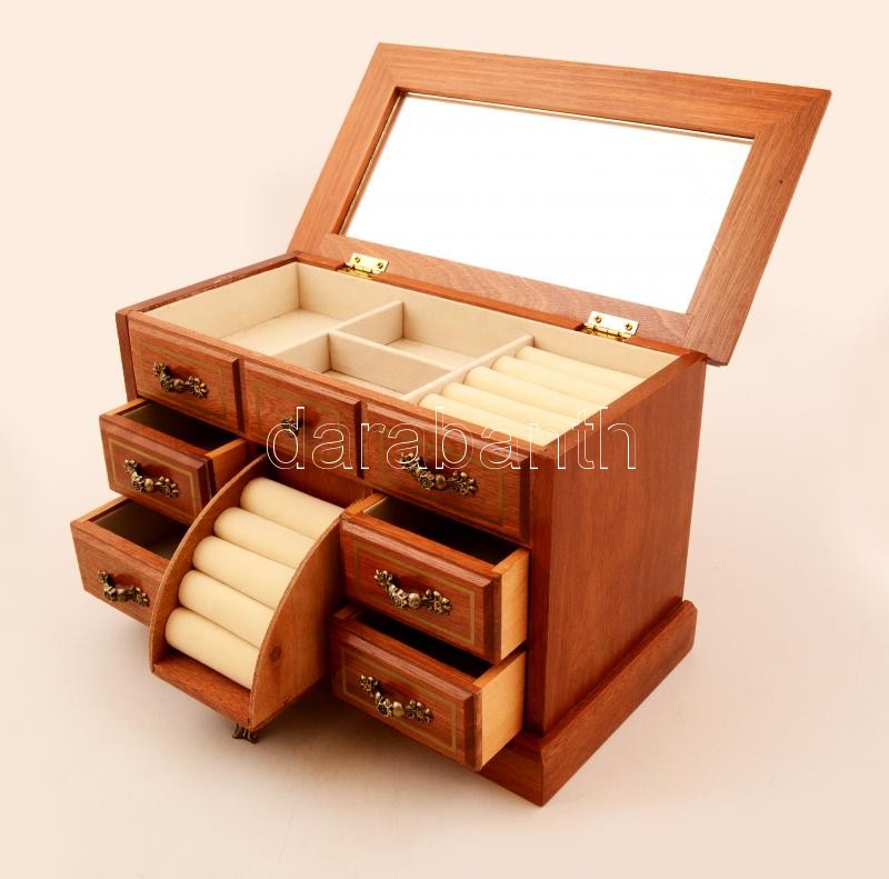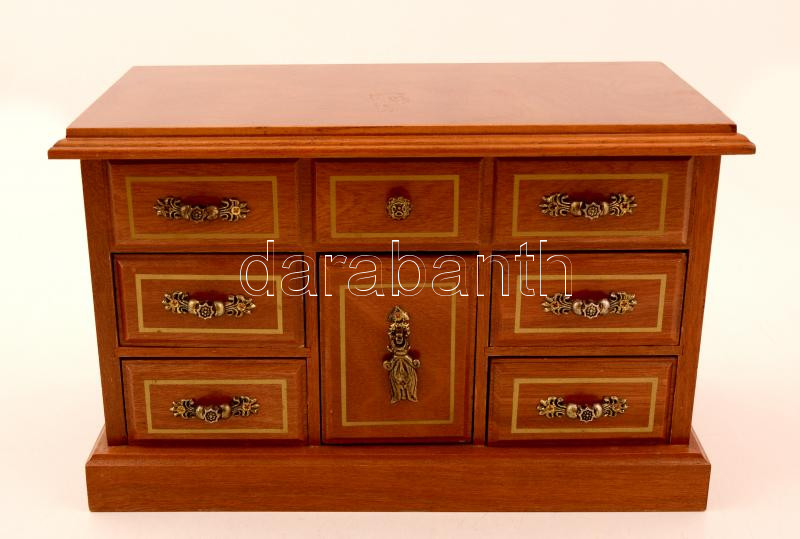 Leírás: Ékszertartó kis fa doboz, réz szerelékkel (egy plusszal), jó állapotban, 28×14 cm, m:17 cm