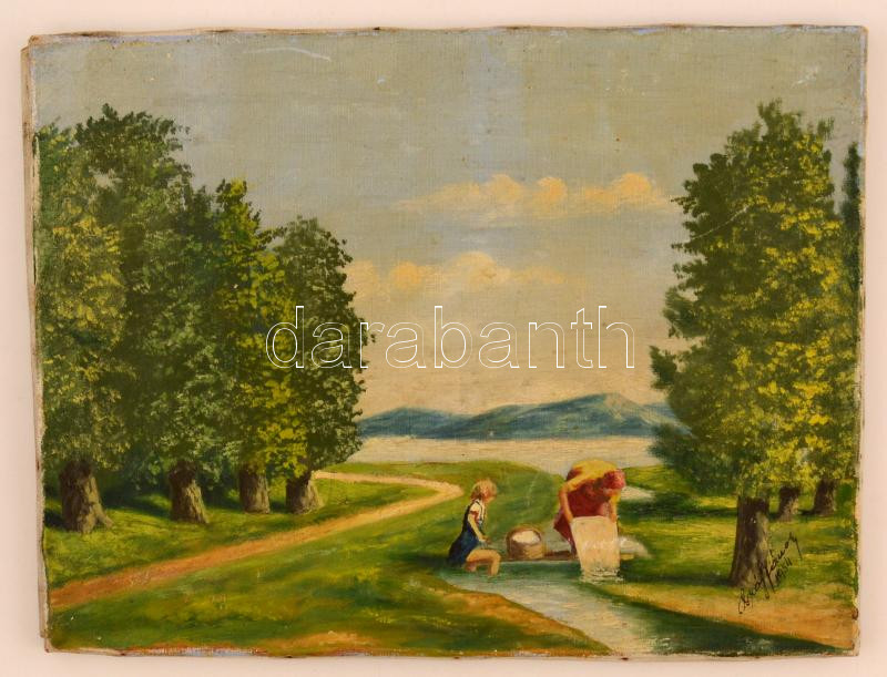Leírás: Gráf János (?-?): Mosó lány és asszony. Olaj, vászon, kopott, 30×40 cm