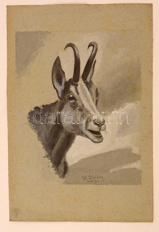 Leírás: Henri Helbig (?-?): Zerge 1911. Vegyes technika, papír, jelzett, 30×25 cm