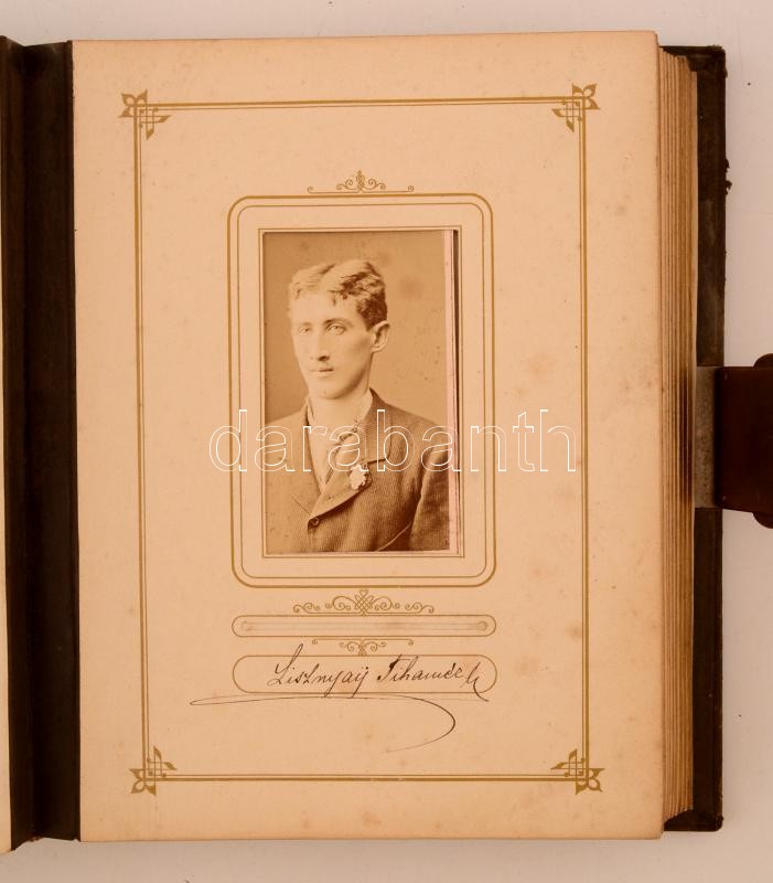 1877 Kiváló állapotú egészbőr kötéses fényképalbum vizitkártya fotók részére. 16 férőhellyel. Kulccsal is zárható fém csattal (kulcs nélkül) minimális kopásokkal, jó állapotban. Aranyozott lapszélekkel.