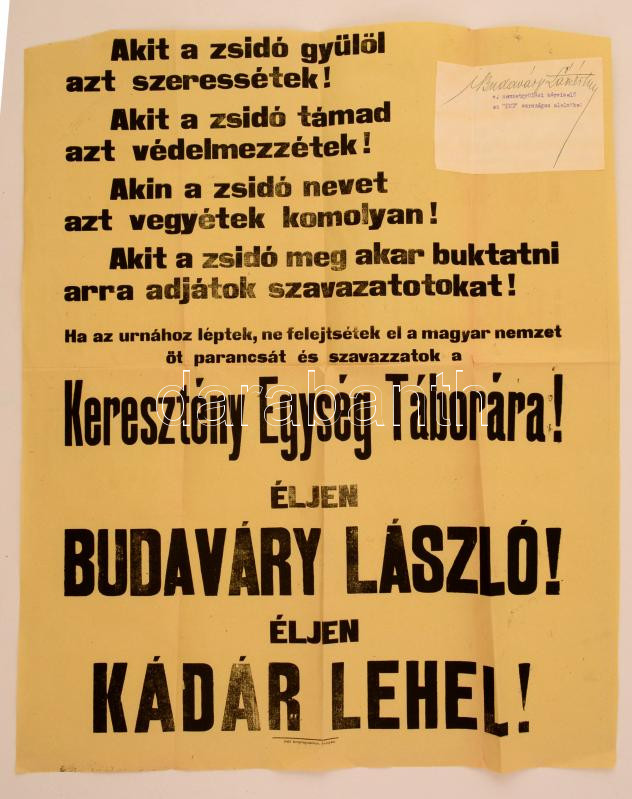 cca 1925 A Keresztény Egység Táborának antiszemita uszító propaganda nyomtatványa, Budaváry László nemzetgyűlési képviselő és az ÉME országos elnökének aláírásával / Hungarian Anti-Semitic public propaganda print 60×50 cm