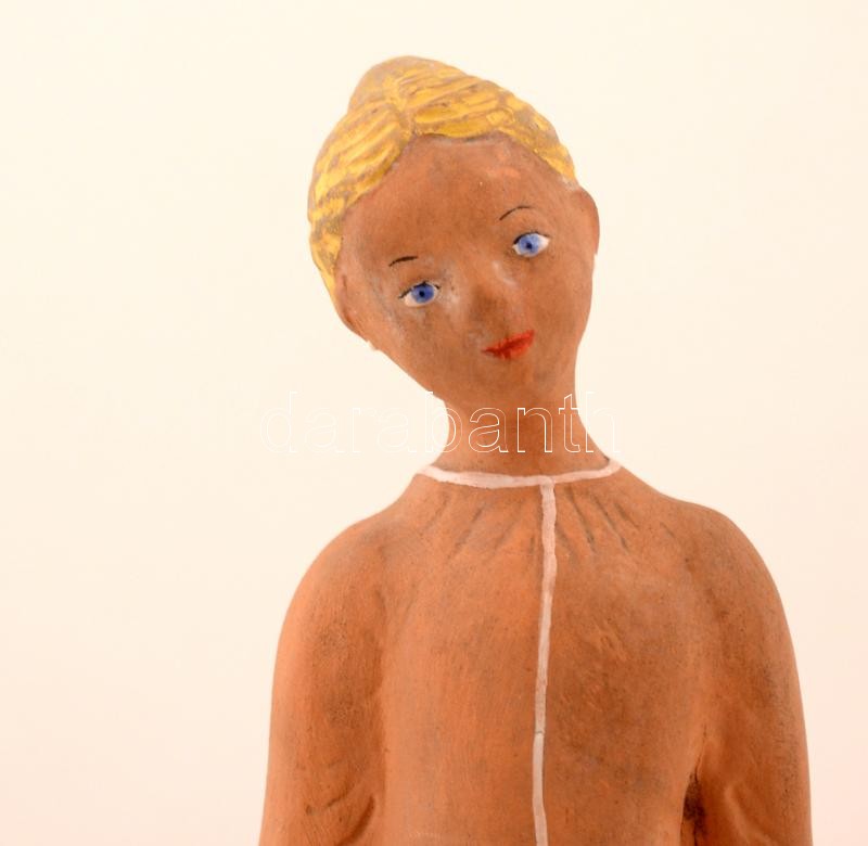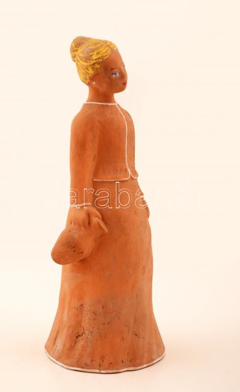 Leírás: KM jelzéssel: Nő korsóval, kézzel festett cserép, m:24 cm