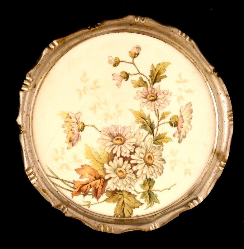 Leírás: Virág mintás fajansz tálka, fém peremmel, kopott, jelzés nélkül, d:15 cm