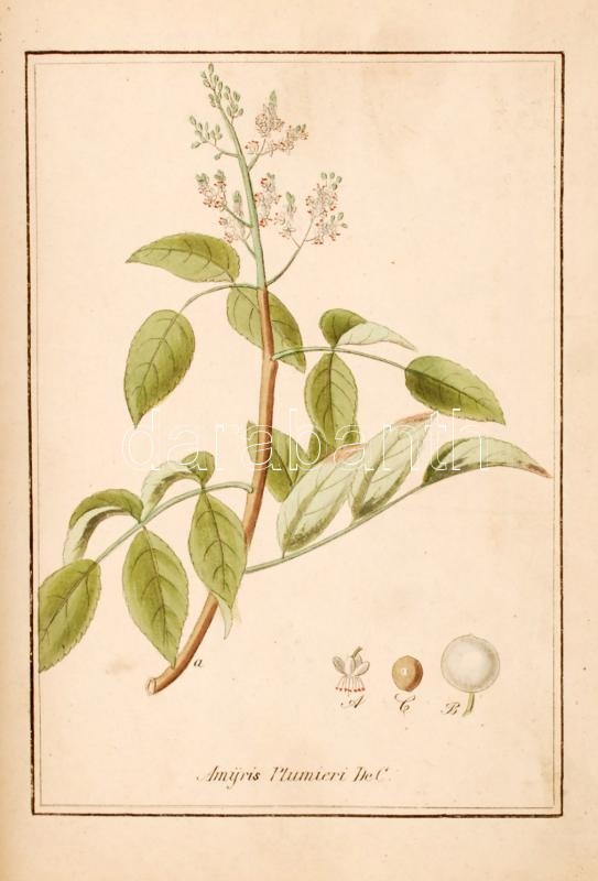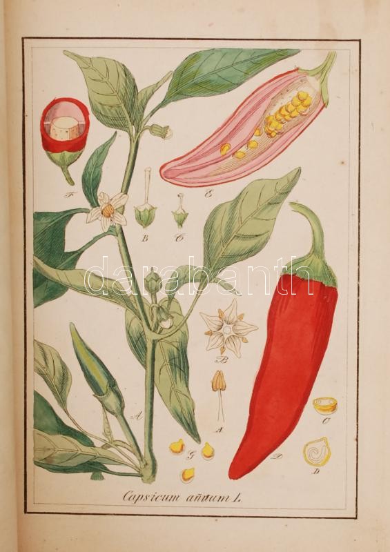 XIX. sz. eleje: 245 db fűszernövény és gyógynövény kézzel színezett rézmetszetes képe. A növények latin neveik szerint alfabetikus sorrendben követik egymást az egészbőr kötéses könyvben. Félbőr kötésben, jó állapotban. / XIXth century first half: Collection of hand colored etcungs of herbs and spices. 245 colored etchings with their latin names in alphabetical order. In half leather binding. Page sizes 16x22 cm