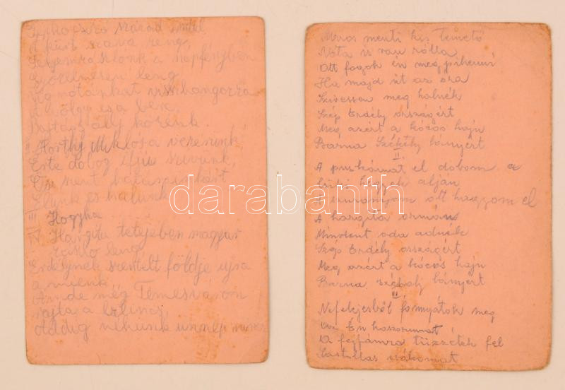 Leírás: 1940 Erdély visszaszerzését ünneplő, hazafias versek 2 db levelezőlapon