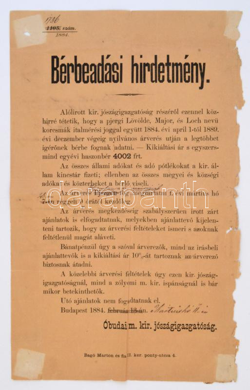 1884 Az óbudai magyar királyi jószágigazgatóság bérbeadási hirdetménye pjergi (Hegybánya, ma: Štiavnické Bane) kocsmák árverés útján történő bérbeadásáról, postán megküldve
