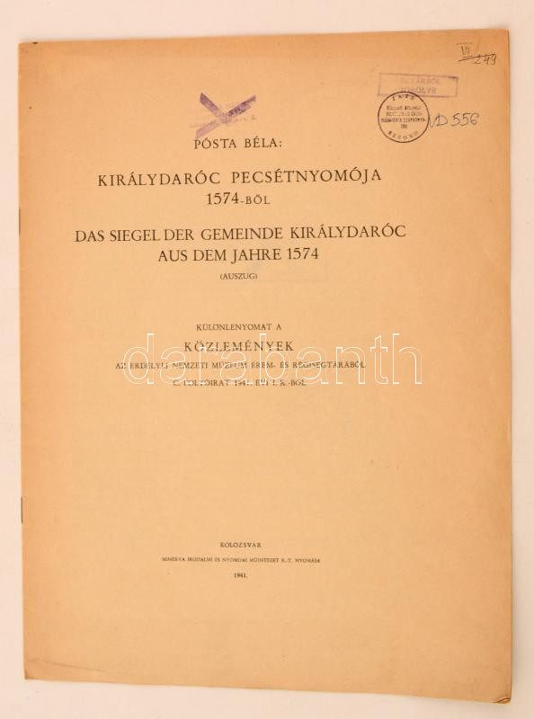 Leírás: 1941 Pósta Béla: Királydaróc pecsétnyomója 1574-ből, különlenyomat a Közlemények az Erdélyi Nemzeti Múzeum Érem- és Régiségtárából című folyóiratból