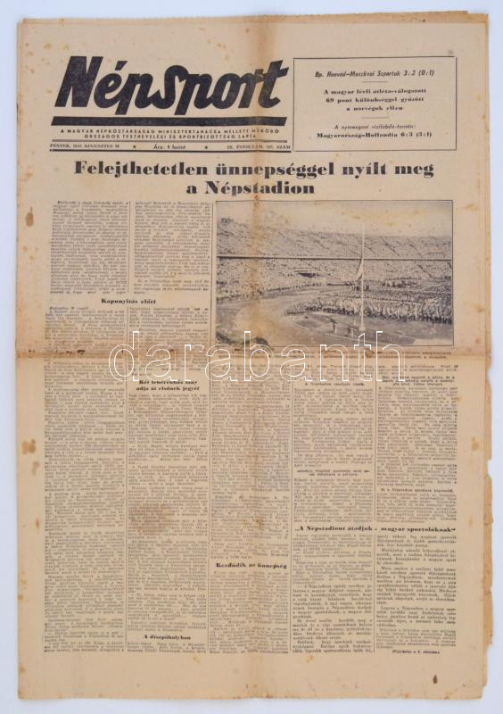 1953 a Népsport 9. évf. 167. száma a Népstadion megnyitásáról https://www.darabanth.com/hu/281-Gyorsarveres/281.0/Festmeny-mutargy-papirregiseg-egyeb/Nyomtatvanyok~28/1953-a-Nepsport-9-evf-167-szama-a-Nepstadion-megnyitasarol~II1452463