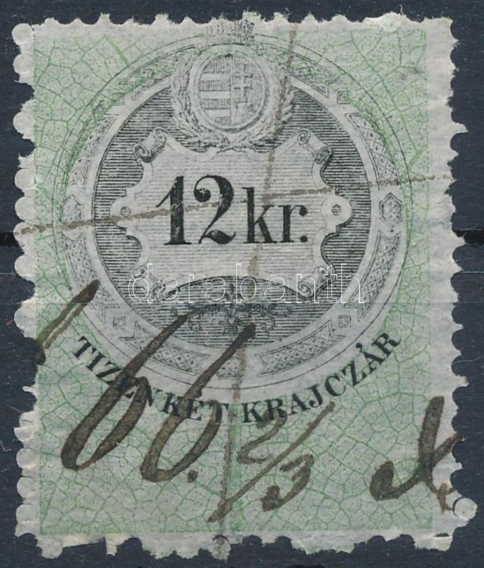 Leírás: 1868 12kr okmánybélyeg erősen elcsúszott középrésszel / with shifted middle part.