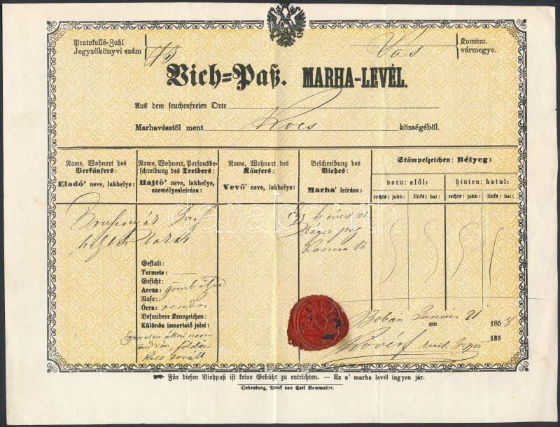 1858 Kocs, magyar é német nyelvű marhalevél, rányomott, kissé töredéke... https://www.darabanth.com/hu/281-Gyorsarveres/281.0/Festmeny-mutargy-papirregiseg-egyeb/Okmanyok~16/1858-Kocs-magyar-e-nemet-nyelvu-marhalevel-ranyomott-kisse-toredekes-viaszpecsettel~II1445429