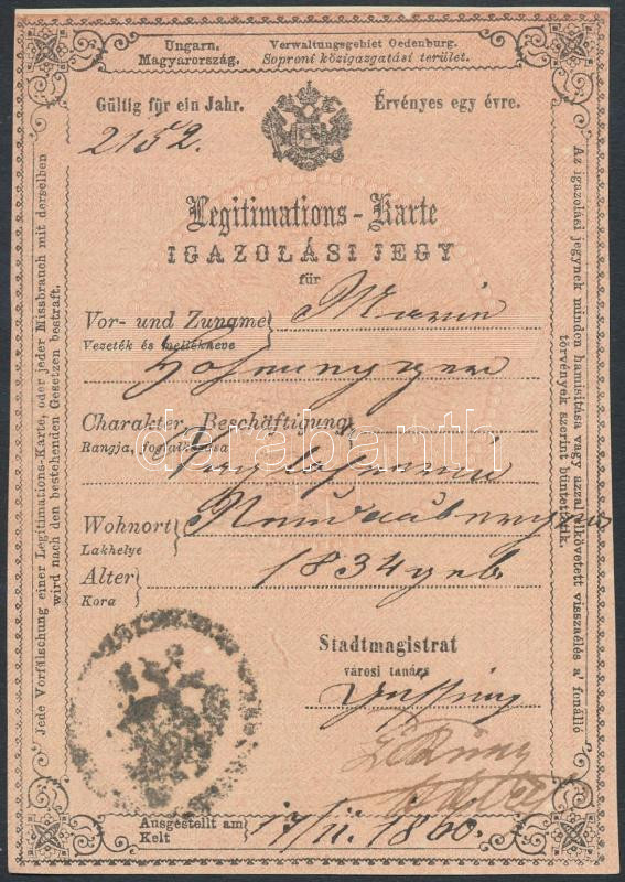 1860 Igazolási jegy, hátoldalon 15 kr okmánybélyeggel / ID https://www.darabanth.com/hu/281-Gyorsarveres/281.0/Festmeny-mutargy-papirregiseg-egyeb/Okmanyok~16/1860-Igazolasi-jegy-hatoldalon-15-kr-okmanybelyeggel-ID~II1452688