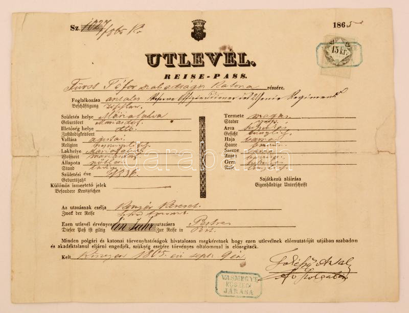 1865 Kőszegen kiállított útlevél katona részére / Passport issued on M... https://www.darabanth.com/hu/281-Gyorsarveres/281.0/Festmeny-mutargy-papirregiseg-egyeb/Okmanyok~16/1865-Koszegen-kiallitott-utlevel-katona-reszere-Passport-issued-on-Murapetroc~II1452631