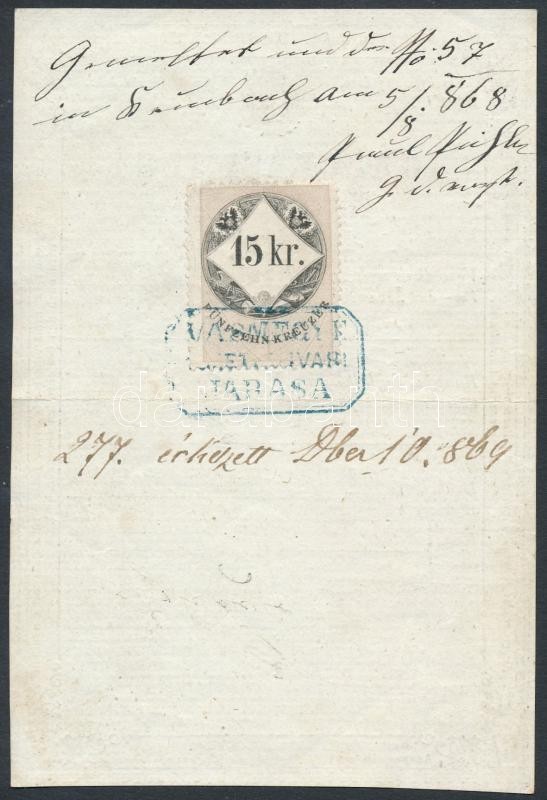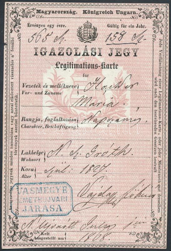 Leírás: 1868 Magyar Királyság által kiállított igazolási jegy, rajta Vas megye németújvári járásának bélyegzőjével, hátoldalon 15 kr okmánybélyeggel / ID