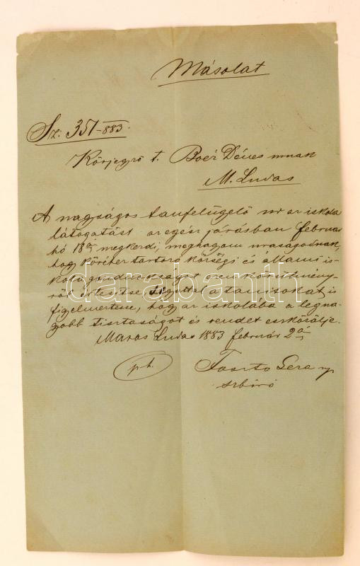 1883 Marosludas, Másolat a tanfelügyelő látogatásával kapcsolatos levé... https://www.darabanth.com/hu/281-Gyorsarveres/281.0/Festmeny-mutargy-papirregiseg-egyeb/Okmanyok~16/1883-Marosludas-Masolat-a-tanfelugyelo-latogatasaval-kapcsolatos-levelrol-rajta-Marosludas~II1448896