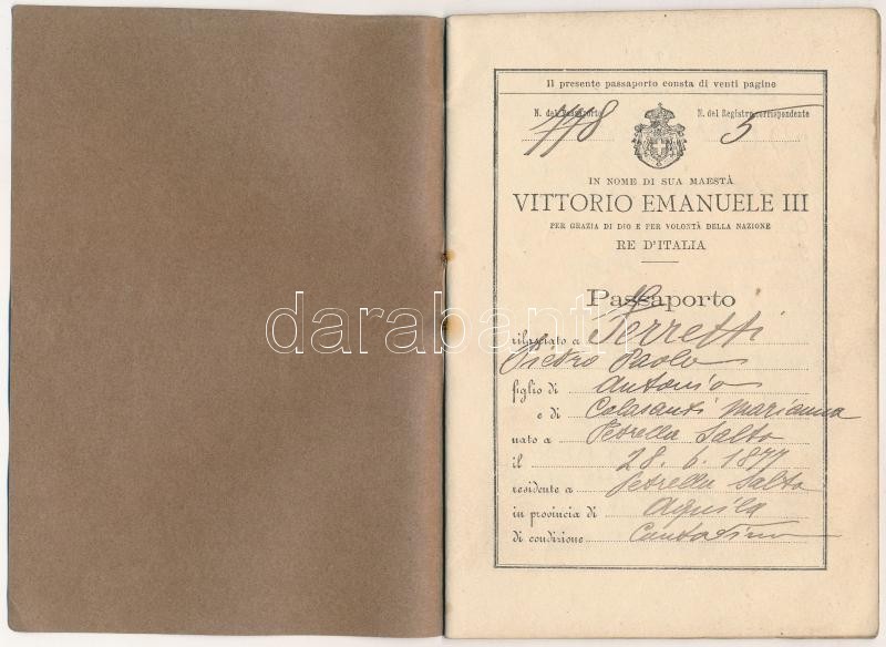 1901 Olasz útlevél / Italian Passport https://www.darabanth.com/hu/281-Gyorsarveres/281.0/Festmeny-mutargy-papirregiseg-egyeb/Okmanyok~16/1901-Olasz-utlevel-Italian-Passport~II1447802