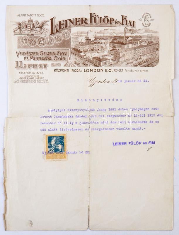 1918 Budapest, Leiner Fülöp vegyészeti gyár Újpest; munkáltatói igazol... https://www.darabanth.com/hu/281-Gyorsarveres/281.0/Festmeny-mutargy-papirregiseg-egyeb/Okmanyok~16/1918-Budapest-Leiner-Fulop-vegyeszeti-gyar-Ujpest-munkaltatoi-igazolas-20-filler-okmanyb~II1452752