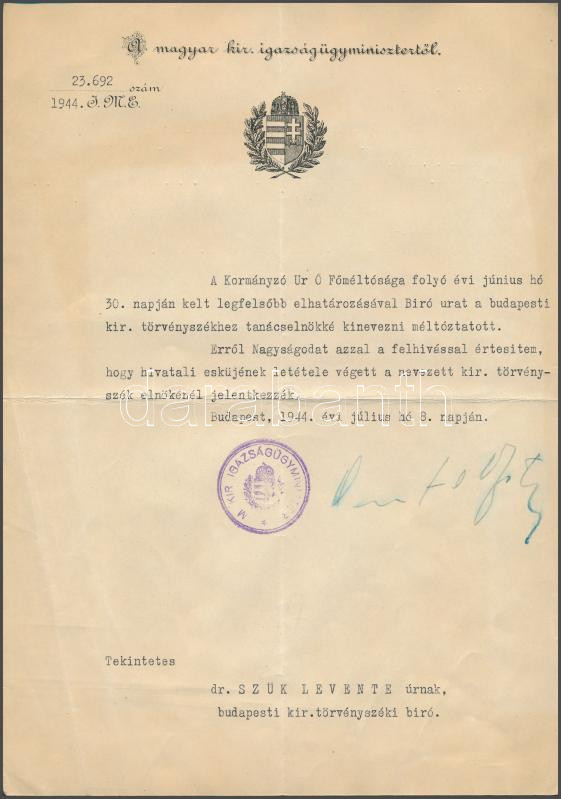 Leírás: 1944 Bp., A m. kir. igazságügy-miniszter által kiadott tanácselnöki kinevezés