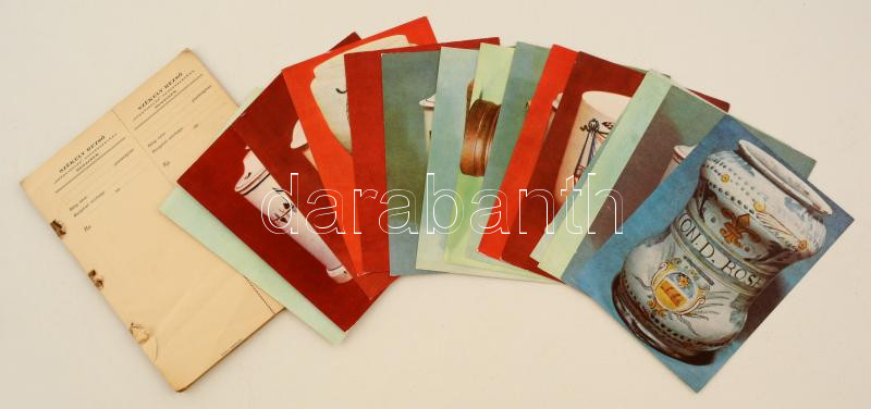Leírás: cca 1920-1940 Demecser, Székely Rezső "Gondviselés" gyógyszertára, kitöltetlen recepttömb + 15 db patikaedény motívumos gyógyszerreklám