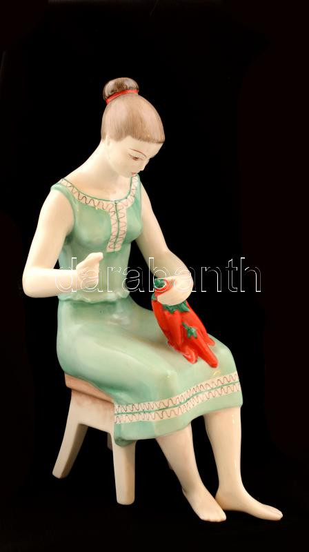 Leírás: Hollóházi asszony (fűszer paprikát fűző), kézzel festett, jelzett, hibátlan, m:25 cm