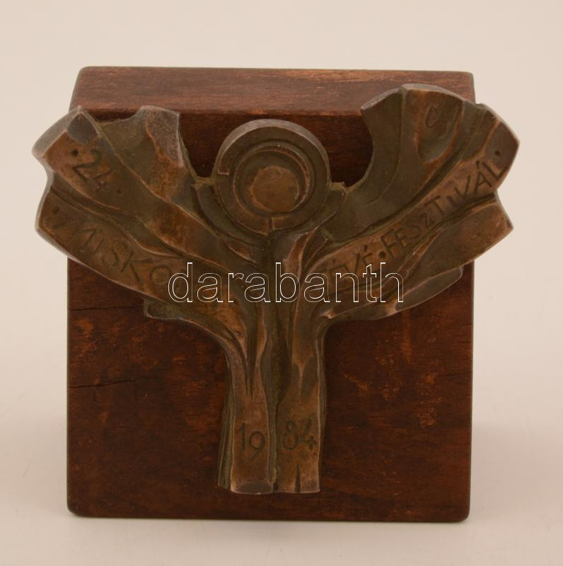 Leírás: Sz. L. jelzéssel: 24. miskolci tévéfesztivál 1984, réz emlék szobrocska, fa talapzaton, m: 8,5 cm