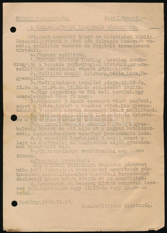1 db. Pockingi Híradó kiadvány. 1945. IX. 14. kiadvány, amely Hazaszállítási Bizottság közleményét tudatja. Gépelt papír, amelynek a másik oldalain eredeti német nyelvű szöveg olvasható.