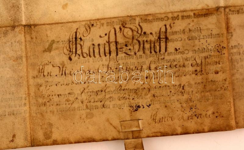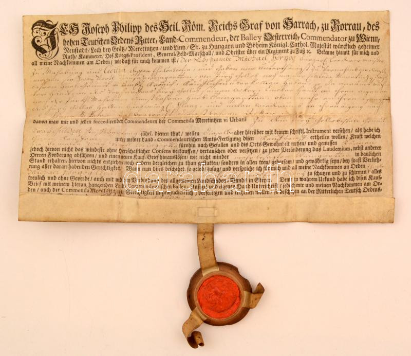 1750 Johann Joseph Philipp von Harrach (1678-1764) az Udvari Haditanács elnöke, a Német Lovagrend osztrák tartománya komturjának birtokadásvételről szóló oklevele, pergamen, fatokos függőpecséttel, jó állapotban