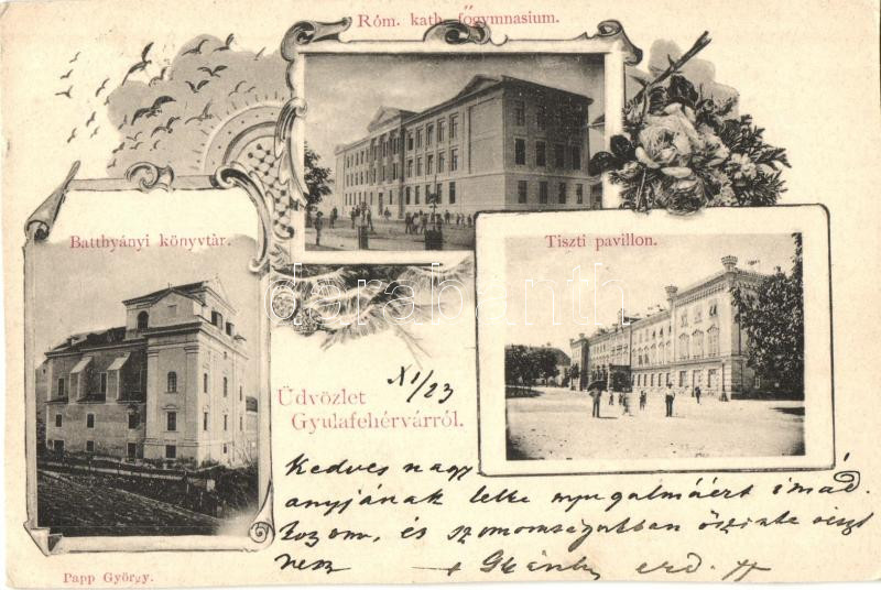 Gyulafehérvár, Alba Iulia; Batthyányi könyvtár, római katolikus gimnázium, tiszti pavillon; Papp György kiadása / library, catholic school, officers pavilion, art nouveau (vágott / cut)