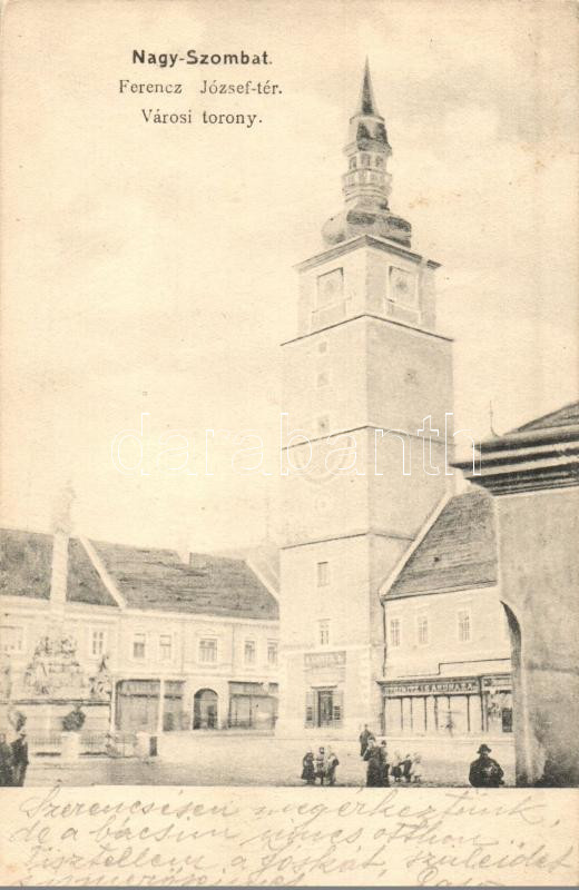 Nagyszombat, Trnava; Ferenc József tér, Városi torony, Steinitz üzlete... https://www.darabanth.com/hu/281-Gyorsarveres/281.0/Kepeslapok/Felvidek~200008/Nagyszombat-Trnava-Ferenc-Jozsef-ter-Varosi-torony-Steinitz-uzlete-kiadja-Fiebig-Jozsef-~II1451864