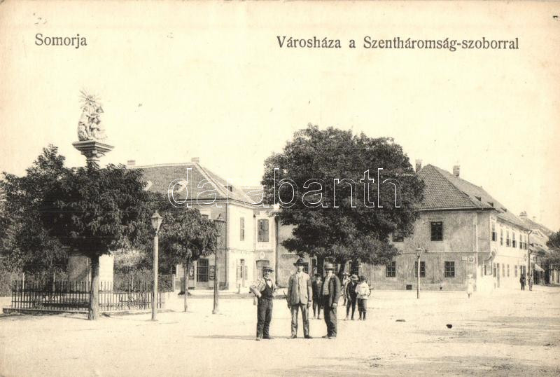 Leírás: Somorja, Samorin; Városháza a Szentháromság szoborral, Goldstein József kiadása / town hall, statue