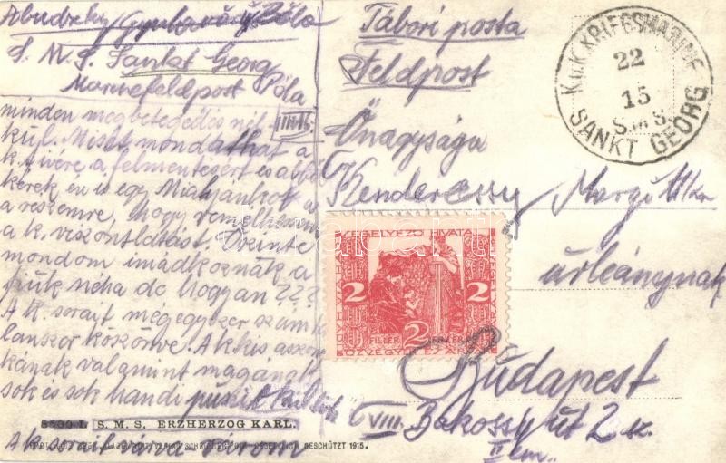 SMS Erzherzog Karl, a K. u. K. haditengerészet csatahajója, tábori posta az SMS Sankt Georgról küldve / Austro-Hungarian Navy pre-dreadnought battleship, sent from SMS Sankt Georg (fa)