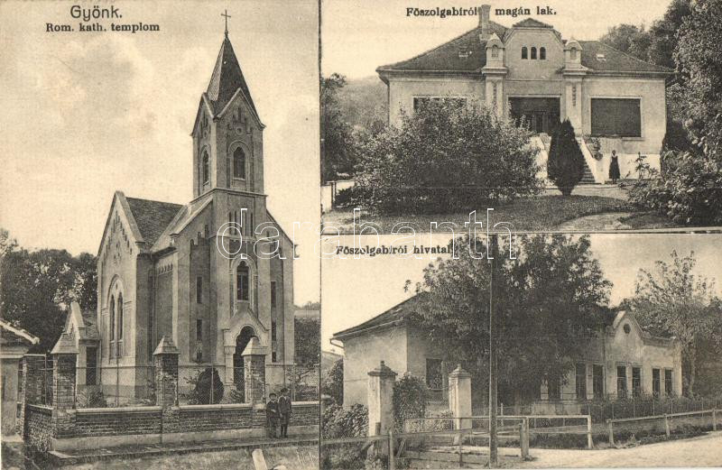 Gyönk, Főszolgabírói magánlak és hivatal, Római katolikus templom (EK) https://www.darabanth.com/hu/281-Gyorsarveres/281.0/Kepeslapok/Magyarorszag~200006/Gyonk-Foszolgabiroi-maganlak-es-hivatal-Romai-katolikus-templom-EK~II1451450