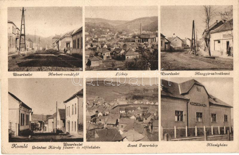 Leírás: Komló, Herbert vendéglő, Hangya szövetkezet, Grünhut Károly fűszer és rőfösüzlete, Szent Imre telep, Községháza