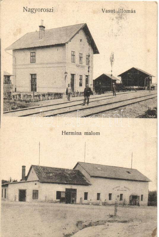 Nagyoroszi, Vasútállomás, Hermina malom, kiadja Hoffmann Dávid https://www.darabanth.com/hu/281-Gyorsarveres/281.0/Kepeslapok/Magyarorszag~200006/Nagyoroszi-Vasutallomas-Hermina-malom-kiadja-Hoffmann-David~II1446736