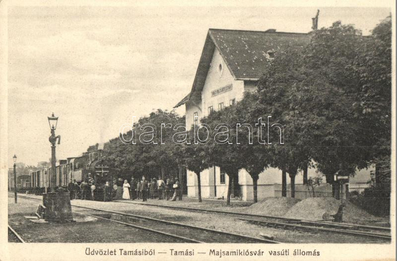 Tamási-Majsamiklósvár, vasútállomás, gőzmozdony, kiadja Jeruzsalem Ede https://www.darabanth.com/hu/281-Gyorsarveres/281.0/Kepeslapok/Magyarorszag~200006/Tamasi-Majsamiklosvar-vasutallomas-gozmozdony-kiadja-Jeruzsalem-Ede~II1447243