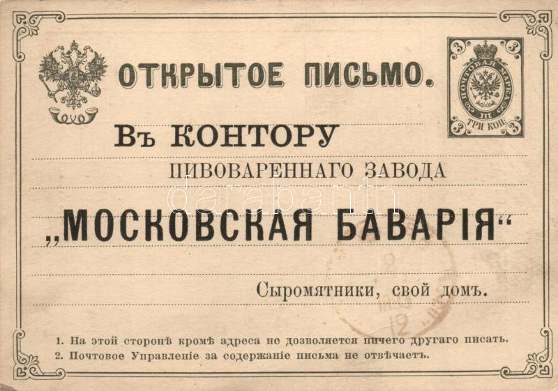 1883 Orosz 'Moszkva' sörfőzde reklám és rendelési levelezőla... https://www.darabanth.com/hu/281-Gyorsarveres/281.0/Kepeslapok/Reklam~200095/1883-Orosz-Moszkva-sorfozde-reklam-es-rendelesi-levelezolapja-1883-Russan-Moscow-bavariya~II1424951