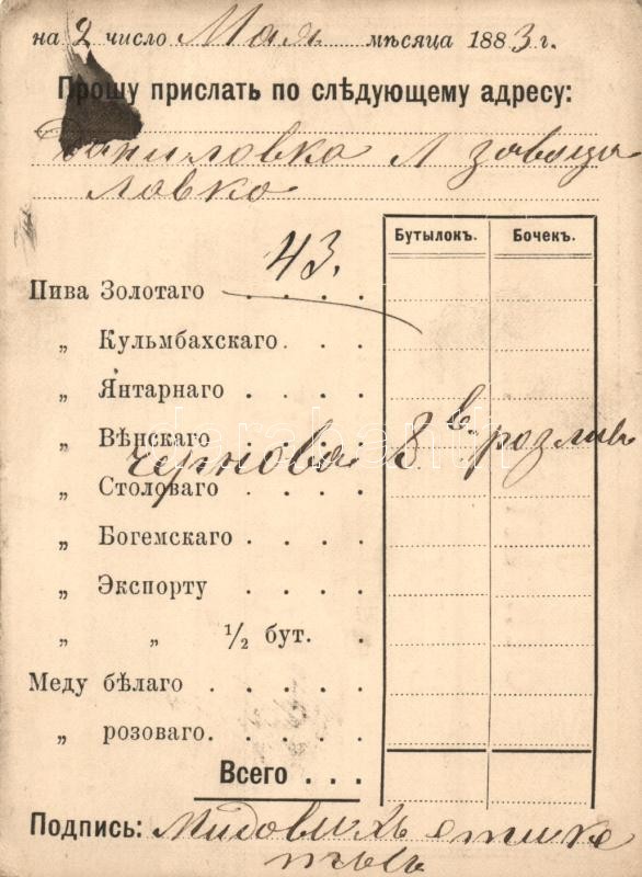 Leírás: 1883 Orosz 'Moszkva' sörfőzde reklám és rendelési levelezőlapja / 1883 Russan 'Moscow bavariya' brewery advertisement postcard (fa)