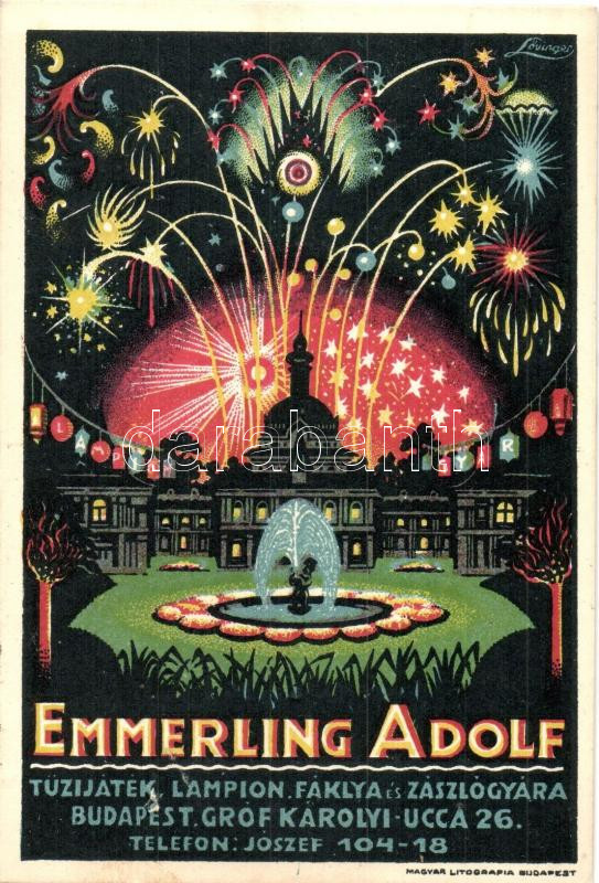 Budapest, Emmerling Adolf tűzijáték, lampion, fáklya és zászlógyára; Gróf Károlyi utca 26. reklám művész képeslap / Hungarian firework, torches and flag workshop advertisement s: Lövinger (vágott / cut)