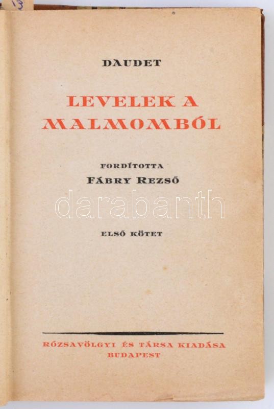 Leírás: Daudet: Levelek a malmomból. Fordította: Fábry Rezső. Bp., Rózsavölgyi és Társa. Bordázott gerincű félbőr kötés, kissé kopott állapotban.