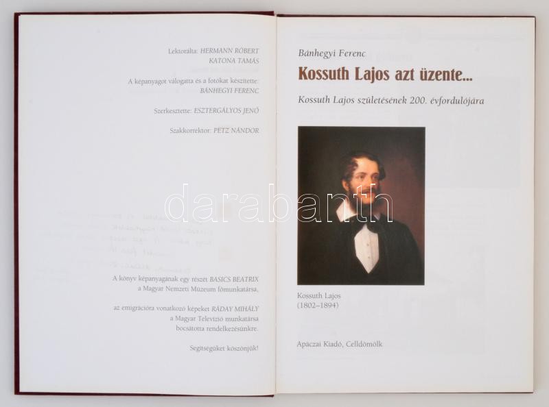 Bánhegyi Ferenc: Kossuth Lajos azt üzenete... Kossuth Lajos születésének 200. évfordulójára. Celldömölk, 2002, Apáczai Kiadó. Kiadói aranyozott bársony kötés, számos illusztrációval, ajándékozási sorokkal. Jó állapotban.