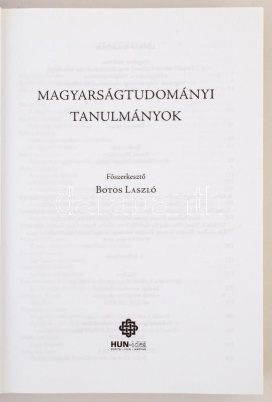 Botos László (szerk.): Magyarságtudományi Tanulmányok. Budapest, 2008, HUN-idea Szellemi Hagyományőrző Műhely. Kiadói kemény papírkötés, kiadói papírborítóban, fekete-fehér illusztrációkkal. Csajághy György, Cser Ferenc, Darai Lajos, Érdy Miklós, Harangozó Imre, Molnár V. József, Obrusánszky Borbála, Poór Miklós és mások tanulmányaiva. Jó állapotban.