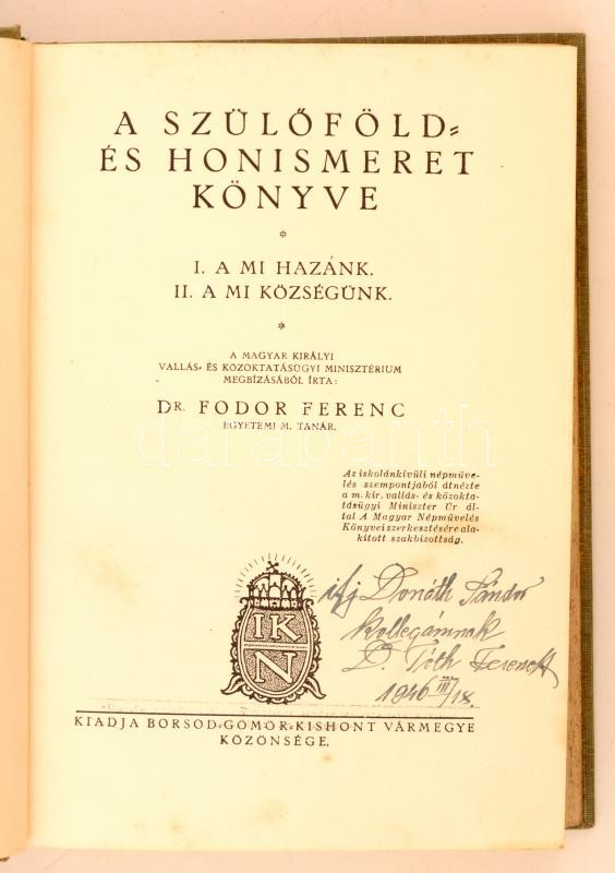 Dr. Fodor Ferenc: A szülőföld és honismeret könyve. I. A mi hazánk. II. A mi községünk. Bp., Borsod-Gömör-Kishont vármegye. Kiadói egészvászon kötés, jó állapotban.