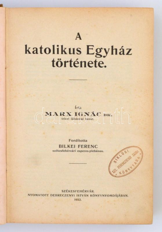Dr. Marx Ignác: A katolikus egyház története. Fordította Bilkei Ferenc. Székesfehérvár, 1932, Debreczenyi István Könyvnyomdája. Kiadói kissé sérült, egészvászon kötésben
