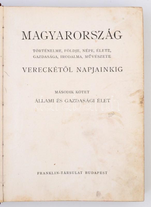 Magyarország történelme, földje, népe, élete, gazdasága, irodalma, művészete Vereckétől napjainkig. Előszót írta: Nagybányai Vitéz Horthy Miklós. II. kötet. Állami és gazdasági élet. Bp., 1929, Franklin. 482 p. Kiadói, kopottas, félbőrkötésben