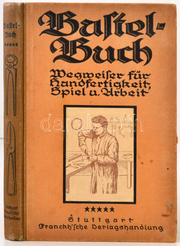 Das Bastelbuch. Ein Wegweiser für jung, und alt in Handfertigkeit, Spiel und Arbeit. V. Stuttgart, é.n., Franckh'sche Verlagshandlung, 4+192 p. Kiadói félvászon kötés, német nyelven. Számos szövegközti képpel és ábrával illusztrálva. Ex libris bélyegzővel. A borítója maszatos, kopott. / Half-cloth binding, in german language. The cover is little bit spotty and worn.